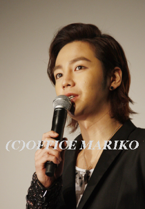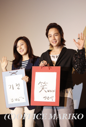 さて、1月23日の旧正月を控えたこの日、日本のお正月の書初めに因んで、二人にも今年の抱負を書初めしてもらいお披露目。キム・ハヌルさんが書いたのは気絶という意味のハングル。日本公開でびっくりして気絶するほどの動員数になることを祈念して。なかなか奇抜な発想だ。ではチャン・グンソク氏は?日本語で「笑 www」。何事も笑顔で楽しみながらすれば成功するという意味。この言葉最近のお気に入りで友人とのメールにも頻繁に使っているそうだ。チャン・グンソク氏の大人気は笑顔になるのも当然と言える。会場のすべてのファンに飛びっきりの笑顔を見せて、舞台挨拶はマスコミ向けのフォトセッションで終了となった。